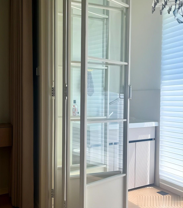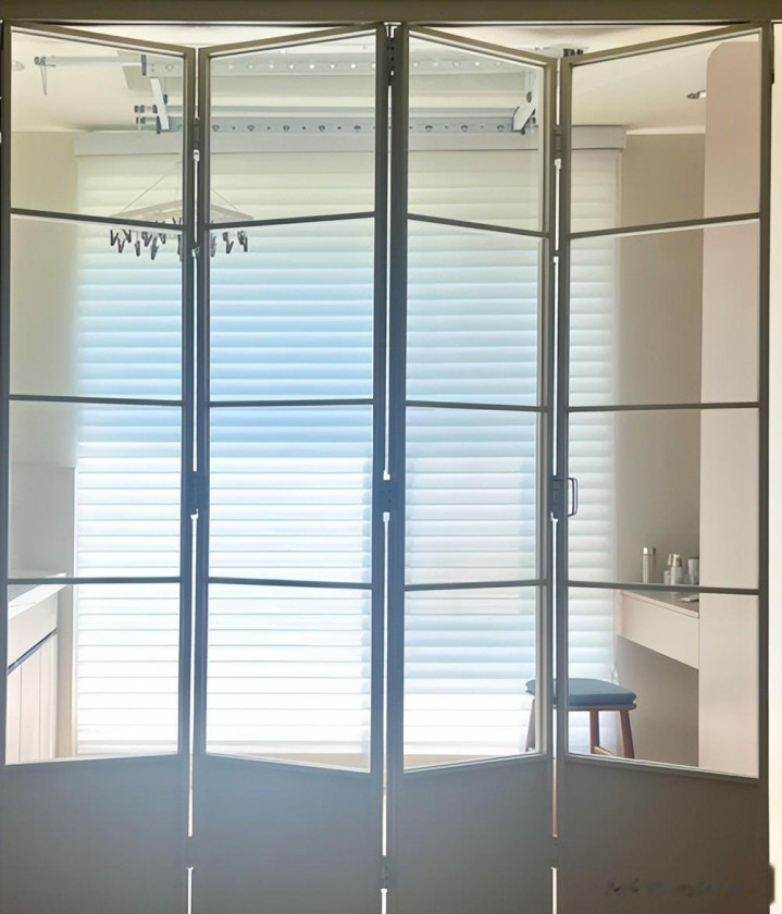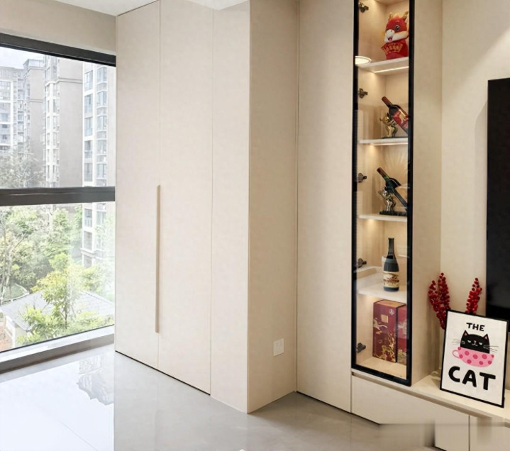 她家把阳台封上后,在中间装了一个极简的折叠门,打开后跟开放式一样,关上就能遮挡光线,我觉得很不错。
