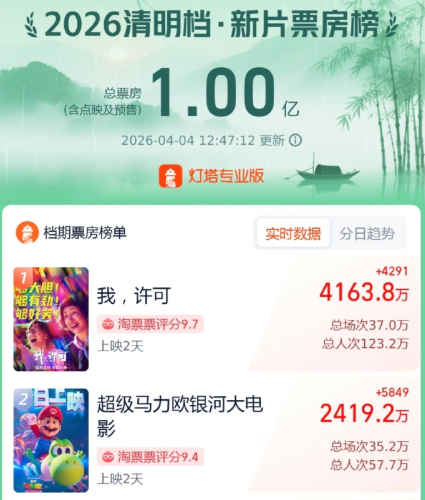 4、2026清明档新片总票房破亿截至4月4日12时,2026年清明档新片总票房(含点映及预售)突破1亿,影片《我,许可》《超级马力欧银河大电影》《我的妈耶》《天才游戏》《蝴蝶楼·惊魂》暂列前五。(央视新闻)